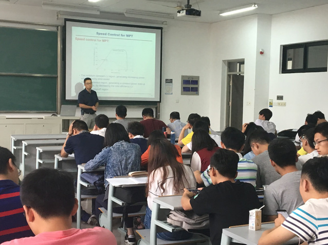 李教授以《Wind Power Systems》为主题,首先介绍了风力发电机的工作原理;然后介绍了风机和风电场群并入电网过程中的功率平衡控制;最后给出了由低电压穿越引起的电力系统次同步振荡问题。针对上述问题,李教授结合工程实例逐步讲解了双馈风机转子侧变流器的次同步振荡抑制方法。同学们从李教授剖析问题的思路中获益匪浅。