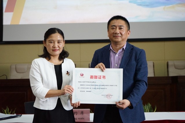 校教育发展基金会办公室主任董雪静老师代表学校与工电8164班校友代表王连伟共同签署捐赠协议,董老师向校友代表颁发了捐赠证书。校党委副书记、副校长李晓军发表讲话,她结合学校党代会的召开和六十五周年校庆活动的举办向大家介绍了学校整体的发展情况,对工电8164班心系母校发展、关心青年成长的善举表示感谢。她指出“自强不息 追求卓越”的电机精神来源于广大校友的传承与积淀,校友的成长与发展很好地印证了“技术立校、应用为本”的办学方略。她要求青年学生要向工电8164班校友们学习,学他们的不忘初心与坚持努力,在继承和发扬电机精神的基础上努力成长成为卓越的高等技术应用型人才,以后也能感恩母校培养,通过各种方式支持学校教育事业的发展。
