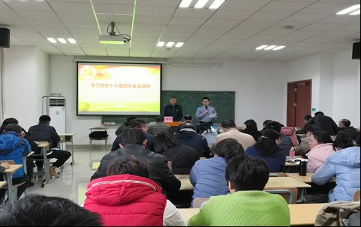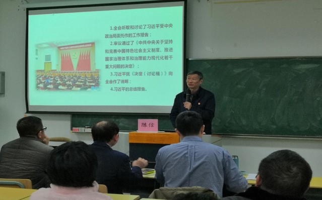 12月20日,jdb电子游戏官方网站在电气楼301召开全体教职员工会议,陈信书记作为学校十九大四中全会精神的宣讲团的一员专题做精神宣讲,学院党委书记吕小亮主持会议。