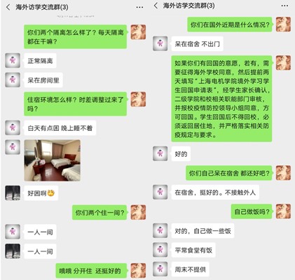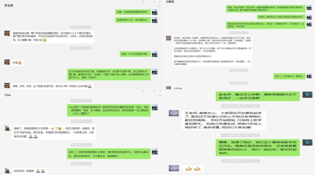 为向海外师生传递防疫信息和正能量,学院积极与海外合作院校保持密切联系,通过视频连线、邮件、微信、慰问函等途径,及时与海外师生分享科学防疫信息和疫情防控经验,协调和回应海外师生关切的签证、学业等问题,关心师生身心健康,与他们一起加油打气,坚定战胜疫情的信心。