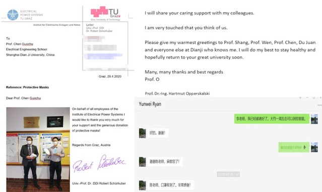 海外师生收到口罩等防疫物资后,纷纷表达对学校及学院的感激之情。海外名师奥地利格拉茨技术大学电力系统研究所所长Robert Schürhuber在感谢信中写道:“我代表电力系统研究所全体员工,非常感谢你们的支持和慷慨捐赠的防护口罩!”海外名师凯撒斯劳滕应用技术大学Hartmut Opperskalski教授回信说:“我会和我的同事们分享你们的关心和支持,我很感动你们想到我们!”在美国、英国等国家的海外名师及访学的老师们也对学校、学院的关心表达了由衷的感谢。在海外访学交流的学生也说到:“非常感谢学校和学院送来的关怀,我们会照顾好自己,有信心打赢这场防疫战。”
