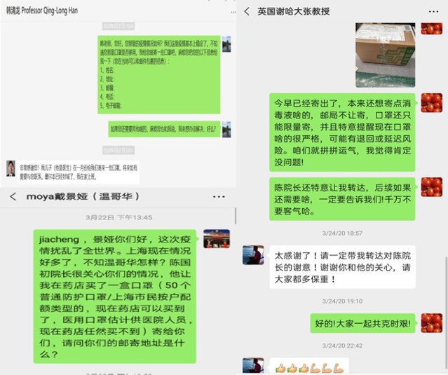 在得知部分海外师生口罩物资缺乏后,学院紧急筹措了口罩等防疫物资,于3月陆续邮寄给在美国、加拿大、英国、德国、奥地利等国家的师生,近日师生们已陆续收到物资。
