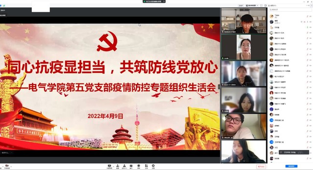 新一轮疫情突然来袭,防控形势复杂。为了团结战疫力量,众志成城共渡难关,4月9日下午,jdb电子游戏官方网站第五党支部组织召开“同心抗疫显担当,共筑防线党放心”疫情防控专题组织生活会。本次组织生活会通过腾讯会议在线上召开,第五党支部全体党员、发展对象共计50余名同学参加了本次会议。