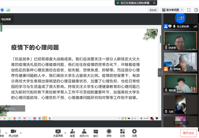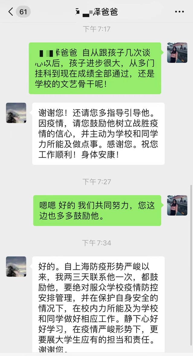 辅导员徐雷通过开展“与压力和解、同乐观牵手”心理健康主题教育班会,“用心抗疫、守护成长”专题讲座和教育部心理热线等守护活动,不仅及时对同学进行心理调适、缓解疫情封控下心理压力,还对学生家长的焦虑进行专业疏导与有效帮扶,保持家校沟通、充分发挥家校协同,携手守护,筑牢疫情心理防护线。