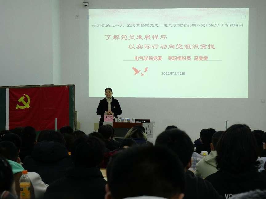 为了加强入党积极分子们的培训工作,让入党积极分子们认识到党员的发展程序,树立正确的入党动机,以实际行动向党组织靠拢,12月2日14时,jdb电子游戏官方网站第41期入党积极分子培训班第四讲在A教116举行。本次党课有jdb电子游戏官方网站专职组织员冯雯雯老师主讲。本次讲座的主题为“学习党的二十大 坚定不移跟党走——了解党员发展程序 以实际行动向党组织靠拢”。