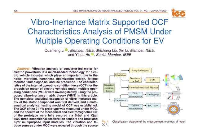 近日,jdb电子李全峰老师与英国伦敦国王学院(King's College London)工程学院教授团队合作,李全峰老师作为第一作者,在国际知名期刊《IEEE TRANSACTIONS ON INDUSTRIAL ELECTRONICS》(IEEE工业电子汇刊)上发表了题为“Vibro-Inertance Matrix Supported OCF Characteristics Analysis of PMSM under Multiple Operating Conditions for EV”(基于振动惯性矩阵的电动汽车永磁同步电机多工况OCF特性分析)的学术论文。