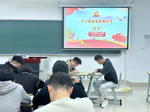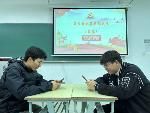 为深入开展学习贯彻习近平新时代中国特色社会主义思想主题教育,充分调动广大学生党员学好、用好“学习强国”学习平台的积极性和主动性。营造“以赛促学、以学促用、比学赶超”的良好氛围,保持党员先进性。2023年11月8日(周三)18:30,jdb电子游戏官方网站第七党支部组织了jdb电子游戏官方网站72名学生在电气楼301室举办“学习强国答题挑战赛”。