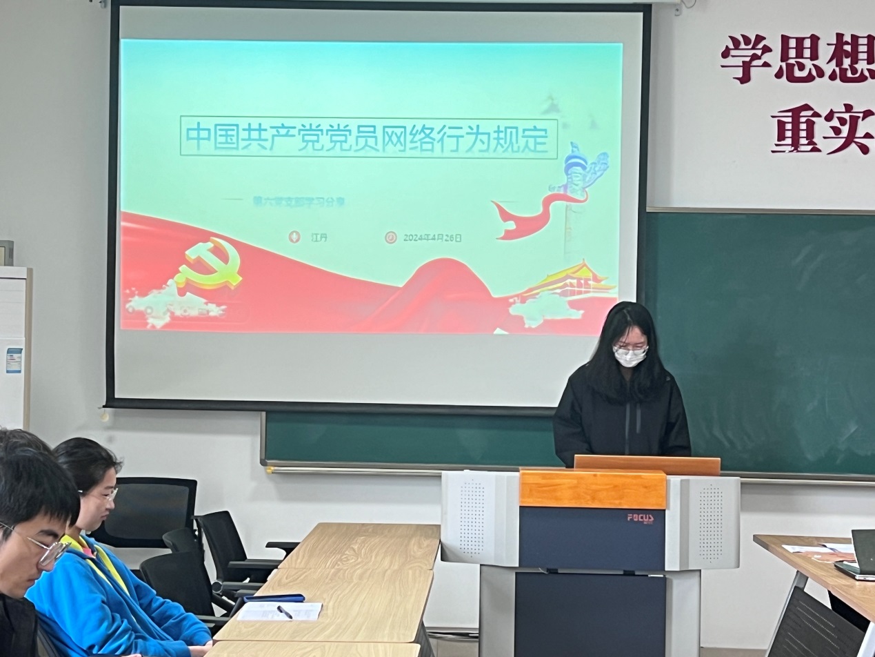 随后,支部党员江丹围绕《中国共产党党员网络行为规定》进行了深入学习和讨论。大家一致认为,网络空间已成为党员活动的重要领域,党员在网络上的言行举止直接关系到党的形象和声誉。因此,全体党员必须严格遵守规定,做到文明上网、理性发声,积极传播正能量,坚决抵制不良信息,维护党的良好形象。