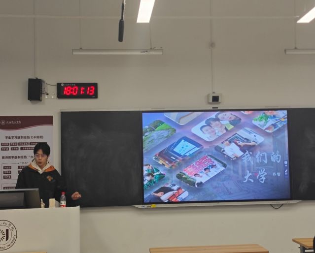齐智站在讲台上,目光温和而坚定,围绕大学生活主题分享了他的成长历程。他谈到,在大学期间应勇于追寻理想、探索未知,尽管过程中可能会遇到挑战与平淡,但每一段经历都是宝贵的成长财富。齐智虽在多方面表现优异,但他也坦诚分享了自己曾面临的英语学习挑战。面对困难,他并未退缩,而是充分发挥自身优势,通过不懈努力获得了老师的认可。在他的讲述中,同学们深刻感受到大学生活的多元与充实,对大学生活的意义有了更清晰的认识。