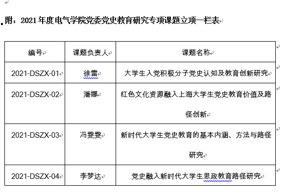 自2021年3月学院党委下达申报党史教育研究专项通知,学院党委共收到4个教工的课题申请材料,经5月11日邀请上海教卫党委党建研究会秘书长顾继虎等专家到学院进行综合评审,经2021年第4次党委(扩大)会审议同意,同意对学院4个党史研究专项课题进行立项,每项资助2000元,课题研究经费从2021年度学院党建工作活动经费中支出。课题结题日期为2021年11月30日。请获得课题立项的有关课题负责人根据校科研管理相关规定,按时、按要求完成研究工作。(立项课题见附件)